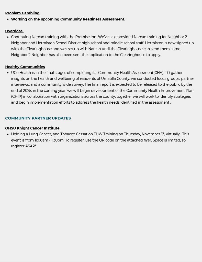 Please contact the Umatilla County Public Health Department at 541-278-5432 or email health@umatillacounty.gov for more information.